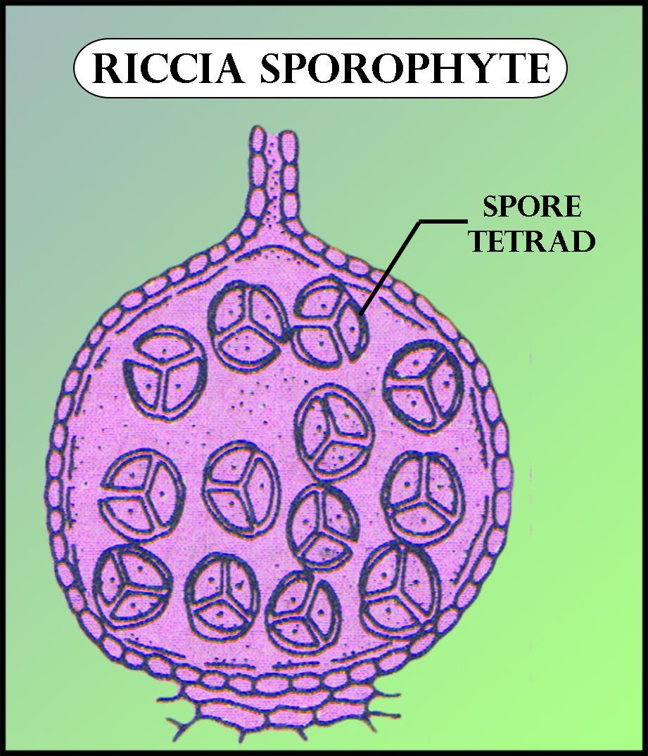Riccia species is the simplest sporogonium present in the liverwort family and Bryophyta division. The sporogonium of Riccia is in the form of a capsule or sac- like structure. There is an absence of foot and seta. The gametophyte is attached to the sporogonium. The sporogonium is dependent on the gametophyte for its nourishment and food as it has non- greener parts. The spore consists of remaining mother cells in the form of the capsule or spore- like sac. The mother cells have a meiotic division to form four haploid spores. These spores form a tetrahedral arrangement. Before the formation of spores, the inner walls of sporogonium and the covering layer are dissolved. The spores contain only a single layer of the covering around them. There is an absence of elaters.