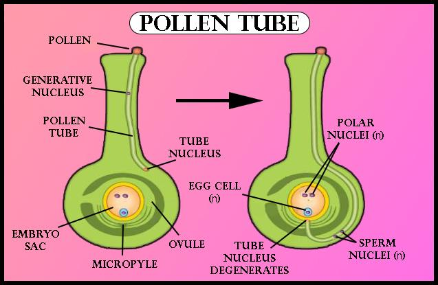 -The growth of the pollen tube is stimulated by a sugary substance produced in the stigma of the flower.