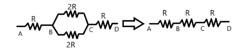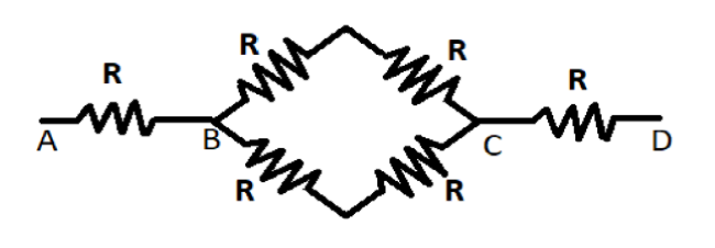 Note:Here, there are four resistances between the points B and C. The two resistances are in series forming two pairs and these pairs are parallel to each other. When the resistances in series will be parallel to each other than the resistance in series will become.
