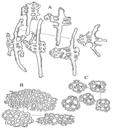 B) Hexactinellida- They have six types of rayed glossy spicules.