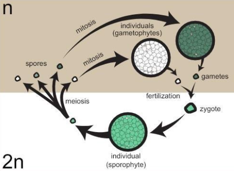 Note: Reproduction via spores involves the spreading of spores by water or air. In heterogeneous organisms, two types of spores exist: microspores give rise to males and megaspores give rise to females. In homosporous organisms, all spores look alike and grow into individuals carrying reproductive parts of both genders.
