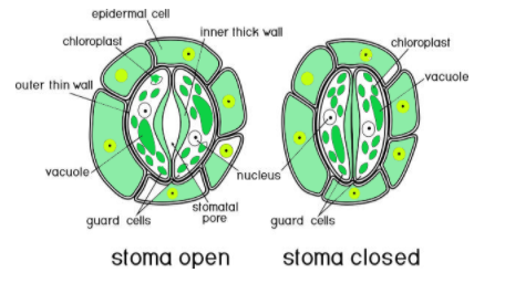 If we look at the structure of stomata, stoma (i.e. plural stomata) possesses two kidney bean-shaped guard cells containing chloroplasts with a respiratory chamber found under each stoma. These guard cells are further surrounded by subsidiary cells and also control the transpiration rate in the stomata. Open and closed stoma as shown in the figure below;