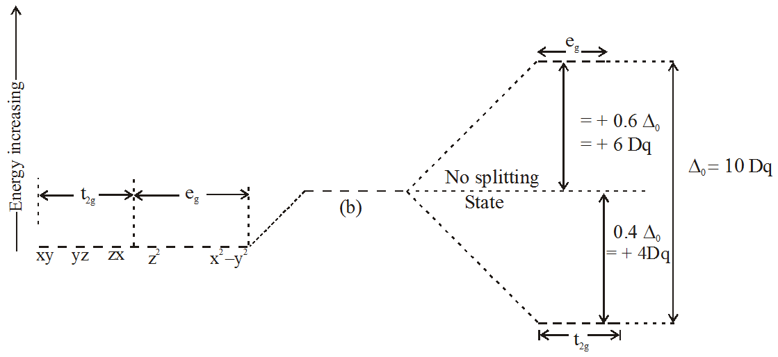 The phenomenon of crystal field splitting in an octahedral complex is illustrated here. The energy difference between two sets of d-orbitals; $$\mathrm{t}_{2 \mathrm{g}} \text { and } \mathrm{e}_{\mathrm{g}}$$ is called crystal field splitting energy and is symbolically represented as $$\Delta_{0}$$.