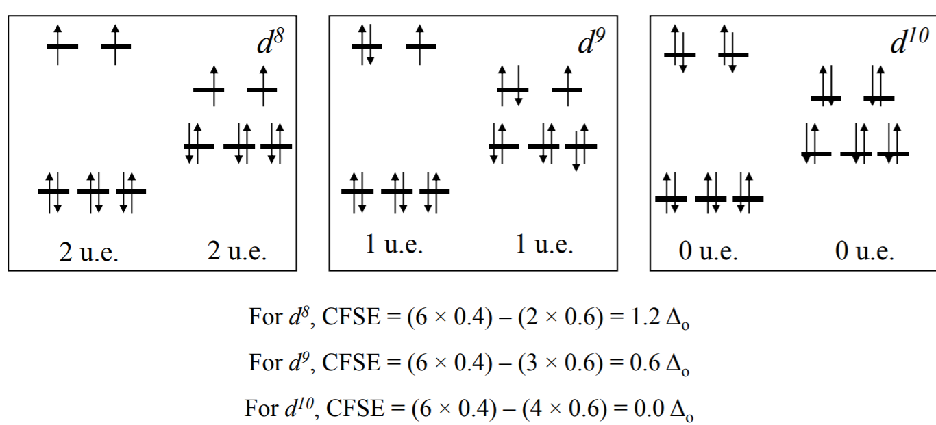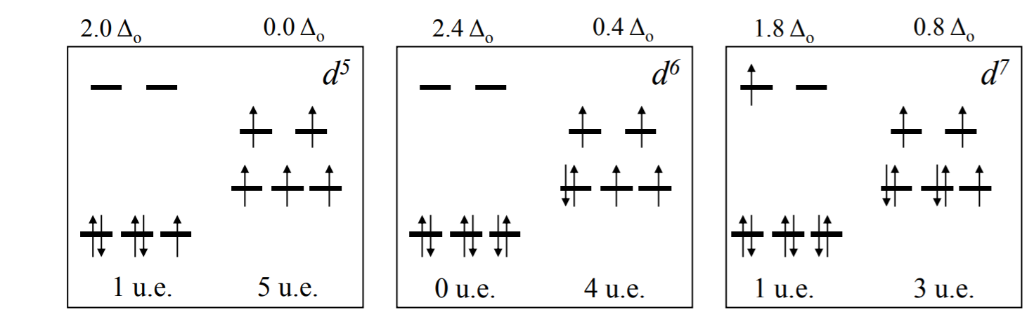 There are two possibilities for metal ions having $$\mathrm{d}^{4}-\mathrm{d}^{7}$$ electronic configuration. Depending on the nature of the ligands and the metal they could be high-spin or low 2 spin complexes. For the $$\mathrm{d}^{4}$$ system, CFSE = For high-spin, (3 × 0.4 ) – (1 × 0.6 ) = 0.6$$\Delta_{0}$$ and for low-spin, 4 × 0.4 = 1.6$$\Delta_{0}$$.