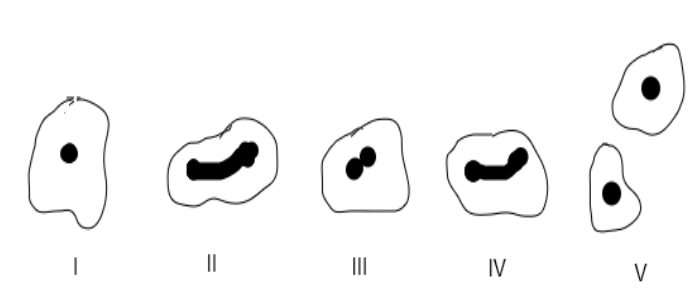 Study the following diagram showing various stages of binary fission in Amoeba: the correct sequence of these diagrams should be