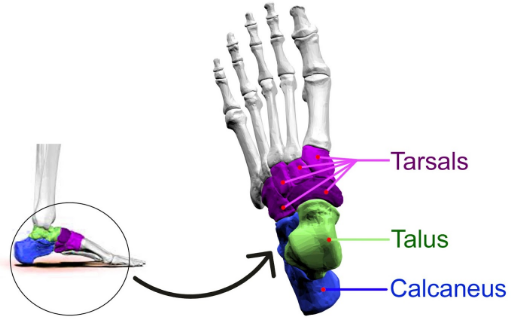 The foot has a few different bones that are all arranged together. These bones can be divided into the hindfoot, the midfoot, and the forefoot. Over here the talus and the calcaneus are the ones that are present in the hindfoot.