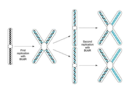 Hint: Various experiments were performed by different scientists to prove that the DNA replication is semi-conservative in eukaryotes. This means that every newly replicated chromosome contains at least one strand from parent strands, and one strand is the newly replicated one.