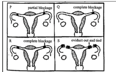 In the figure R, there is complete blockage of fallopian tubes. This rules out any chance of fertilisation.