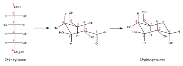 Here, we can see the carbon atom that is next to the oxygen atom in the pyranose ring, and we can determine that it is the same carbon that is present in the aldehydic group in the Fischer projection formula.