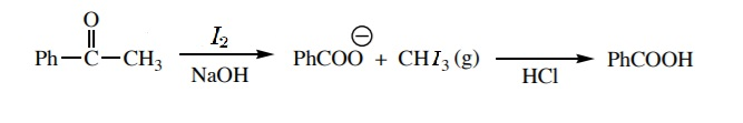 Note: This reaction is often performed using iodine and as a chemical test for identifying methyl ketones. Iodoform is yellow and precipitates under the reaction conditions. Iodine in an alkaline medium such as sodium hydroxide or potassium hydroxide act as an oxidizing agent.