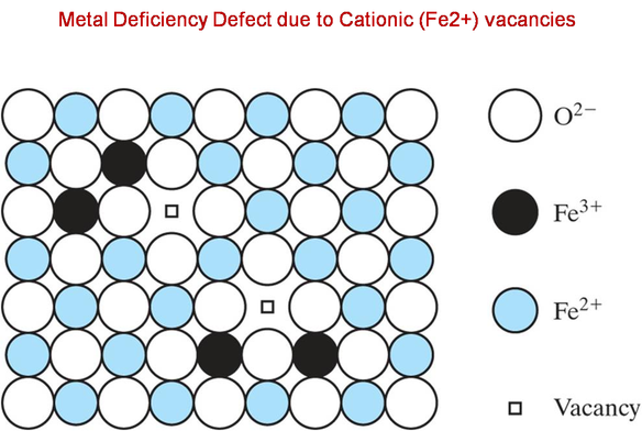 a)In a metal deficiency defect, a cation is missing from its lattice site. To maintain electrical neutrality, one of the nearest metal ions acquires an extra positive charge.