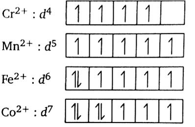 In all the given complexes, the oxidation state of metals such as \[{\text{Cr,Mn,Fe and Co}}\] is +2 thus the outer shell electronic configuration becomes \[{{\text{d}}^{\text{4}}}{\text{,}}{{\text{d}}^{\text{5}}}{\text{,}}{{\text{d}}^{\text{6}}}{\text{ and }}{{\text{d}}^{\text{7}}}\] respectively. The 3d orbital diagram for each complex can be depicted as below: