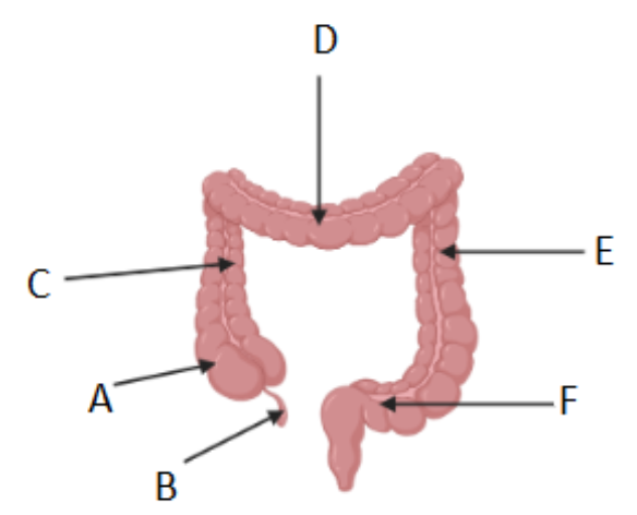 The diagram of the large intestine of a man is given below. Identify the parts labeled A, B, C, D, E, and F.