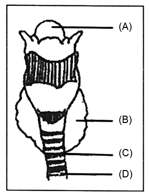A) A- Larynx, B- Parathyroid, C- Tracheal cartilage, D- Trachea