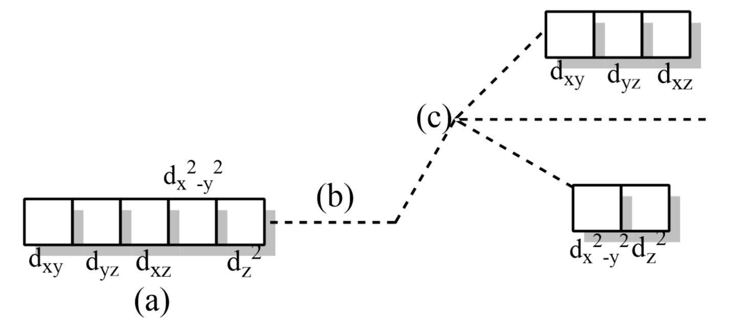 (c) Splitting of degenerate d-orbitals into ${{t}_{2g}}$ and ${{e}_{g}}$ orbitals.