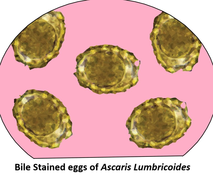Ascaris lumbricoides is also known as roundworm. Its eggs are bile stained. It belongs to the class chromadorea of phylum Nematoda. It is a parasite that infects humans via the fecal-oral route. Fertilized and unfertilized eggs of Ascaris lumbricoides are passed in the stool of the infected host. Fertilized eggs are rounded and have a mineral layer that is often stained by bile as they pass through the excreta.