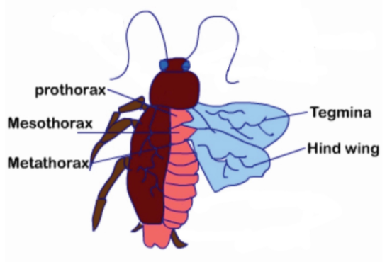 The Mesothoracic Forewings in cockroaches are called tegmina. The body of a cockroach is segmented. It is divisible into; head, thorax, and abdomen. They have a long antenna, legs, and flat extensions of the upper body wall. The thorax consists of three parts namely, prothorax, metathorax, and mesothorax. The first pair of wings in the cockroach arise from the mesothorax and the second pair from the metathorax. Forewings are called tegmina. tegmina are opaque dark and leathery and they cover hind wings when at rest. The hind wings of cockroaches are transparent and membranous. they are used in flight. The abdomen is the last part, and it contains reproductive organs. The number of abdominal segments is the same in both sexes. The 10th segment possesses a pair of jointed filamentous structures which is known as anal cerci.