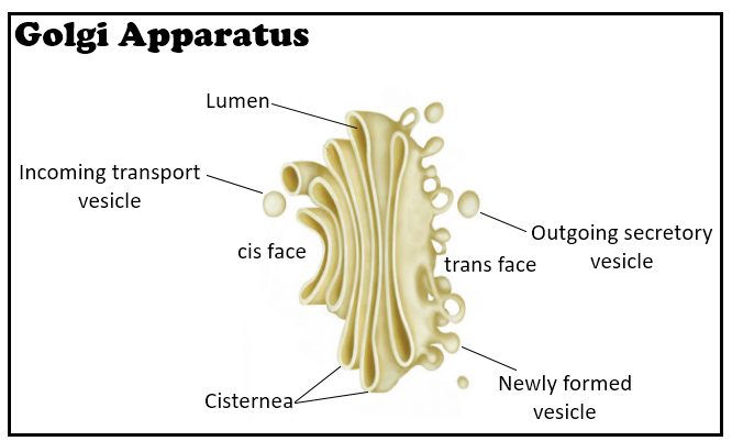 Golgi apparatus is a cell organelle found in the eukaryotic cells. It was discovered by Camillo Golgi in 1897 by an Italian physicist. Golgi apparatus forms a complex of vesicles and folded membranes within the cytoplasm that is involved in secretion and helps in intracellular transport. The appearance of the cisternae is generally compared to a stack of deflated balloons. Vesicles that extend from the endoplasmic reticulum enter the stacks of the Golgi body. It plays an important role in the modification and transport of proteins generated in the Endoplasmic Reticulum within the cell. The main function of this apparatus is to direct the carbohydrates and proteins, needed by the body, to their proper destination. The functions of cisternae change as it undergoes different stages of maturation. Immature cisternae receive vesicles from the endoplasmic reticulum. The next stage begins when cisternae swap material via vesicles at carbohydrate synthesis. When the cargo proteins are sent to transport carriers the mature cisternae reach the final stage.