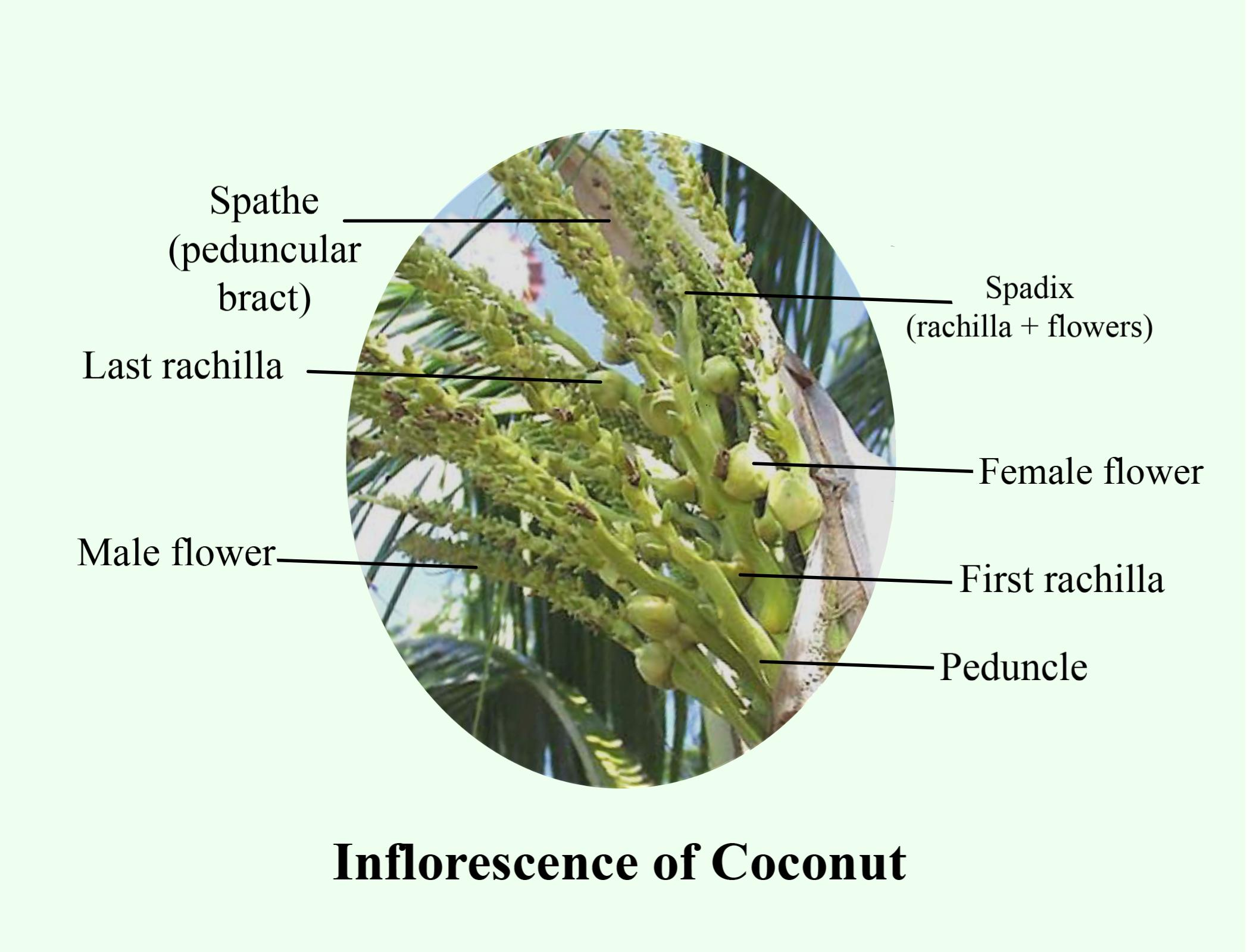 In coconut plant inflorescence is enclosed within the double sheath and this whole structure is named as a spadix. It is born singly on the axis of the leaf of the plant. This type of inflorescence in the plant carries both male and female flowers and is monoecious in nature. The male flower is abundant as compared to the female flowers. The male flowers are born on the top portion of the spikelets and the female flowers are present on the base of the spikelet. The inflorescence can be seen after the leaf primordium arises and differentiates to give rise to the male and female flowers. The male flower is the first one to open up and then it sheds its pollen grains then female flowers are receptive for only two to three days which depends on the environmental conditions the flower is present in. The phase in which the male and female flowers open is known as a spathe. In an inflorescence, there are only ten to twelve female flowers present and only some of them are able to germinate. The remaining flowers develop into the fruits which take about a year to mature.