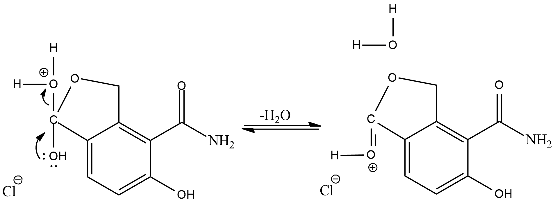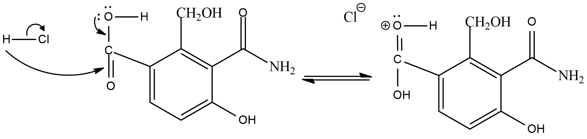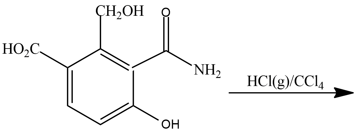 Hint : In the given compound, the functional groups carboxylic acid, methyl alcohol, amide, alcohol are attached to the benzene ring. The catalysts used here are concentrated hydrochloric acid $ HCl\; $ and Carbon tetrachloride $ CCl_4 $ is used as a solvent. These catalysts promote the dehydration reaction in the compound.