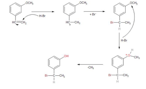 -Then, the bromide gets attached to the carbocation, forming bromo-substituted alkane, that is, m-(1-bromoethyl) anisole.