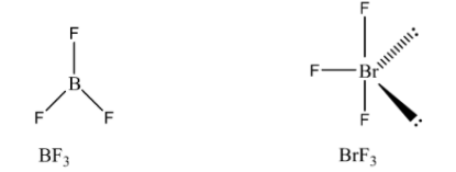\[B{F_3}\] have the \[s{p^2}\] hybridization but \[Br{F_3}\] (Bromine Trifluoride) have the \[s{p^3}d\] hybridization. So, \[B{F_3}\] is triangular (Trigonal planar) in shape having bond angle \[120^\circ \] but \[Br{F_3}\] is ‘T’ shaped or trigonal bipyramidal with a bond angle of \[86.2^\circ \].