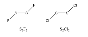\[{S_2}{F_2}\] (Disulphuric difluoride) is a halide of sulphur have the \[s{p^3}{d^{}}\] hybridization. Its shape is gauche (half-open book shape) which is similar to \[{H_2}{O_2}\] with bond angle of \[108.3^\circ .{S_2}C{l_2}\] is a polar molecule and has \[s{p^3}d\] hybridization. It has the shape of gauche.