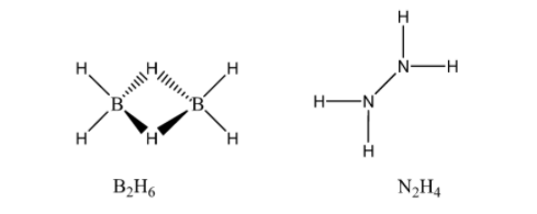 In (Diborane), Boron is \[s{p^3}\] hybridised, there are two terminals \[B - H\] bonds for each boron atom and there are only 12 bonding electrons available. The structure of Diborane molecule consists of 4 H atoms and that of two boron atoms coming on the same plane. In between these planes, there are said to be two dividing atoms of H. The two atoms of B left with that of each unpaired electron orbital and empty orbital forms the two bridging’s \[\left( {B-H-B} \right)\] bonds with that of the two 1s hydrogen atoms, is also called as the banana bond and on the other hand, \[{N_2}{H_4}\] (Nitrogen hydride or Hydrazine) is a strong base. Each subunit of \[{H_2}N - N\] is pyramidal and \[N - N\] bond distance is about \[1.4A^\circ \].