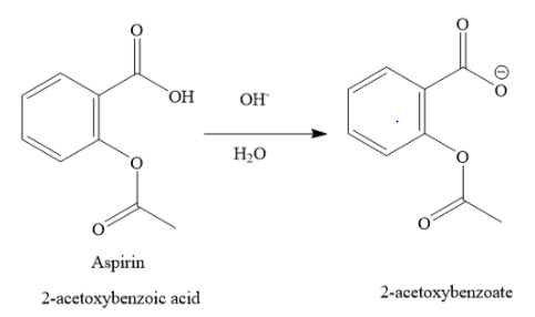 In the acidic medium, aspirin does not undergo ionisation. In basic medium, the carboxylic functional group of aspirin ionizes to form carboxylate anion.
