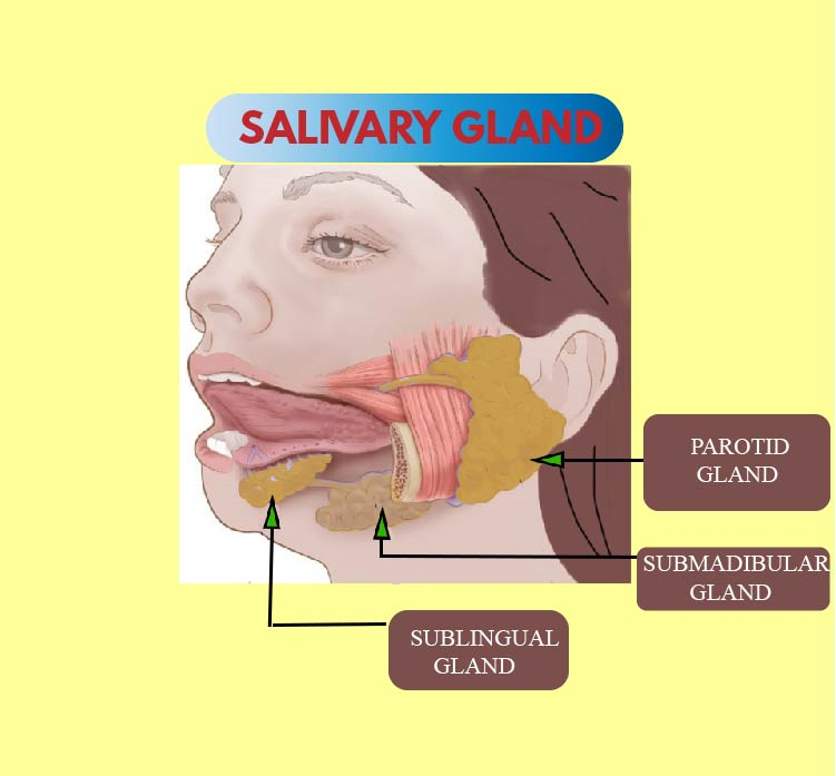 -Now, the saliva produced by the salivary gland will mix the food completely. Saliva is secreted from the parotid, the submandibular, and the sublingual glands present in our mouth.