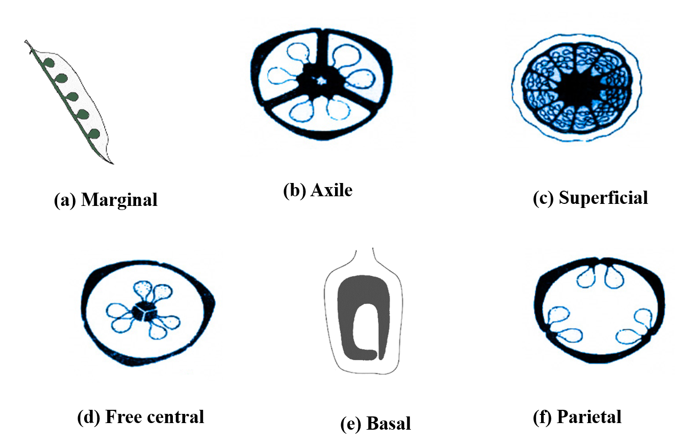 Marginal placentation- In marginal placentation, the placenta forms a ridge along the ventral suture of the ovary and the ovules develop on it making two separate rows. This type of placentation is found in pea plants.