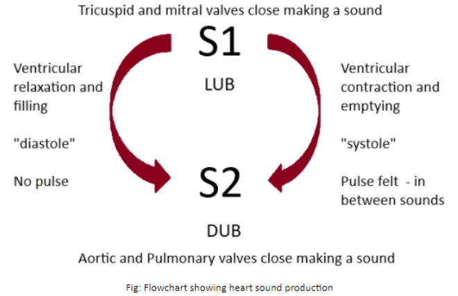 Physiologically, four heart sounds are produced per cardiac cycle, but in a normal heart, only the first and second heart sounds because these are loud enough to be heard through a stethoscope. The first heart sound is significantly low-pitched, soft, and relatively long, sounding like lubb. The second heart sound has a higher pitch and is shorter and sharper, sounding like dupp. Thus one normally hears “lubb-dupp-lubb-dupp…..”. The first sound is associated with the closure of the tricuspid valve, whereas the second sound is associated with the closure of the semilunar valves (the pulmonary valve and the aortic valve). Thus, the first prominent sound is heard when the ventricles contract at systole, and the second sound is heard when the ventricles relax at the beginning of diastole. No sound is produced by the opening of valves.