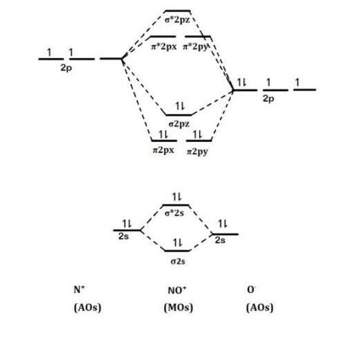 Now, let us see the MO diagram of $N{{O}^{+}}$ molecule-