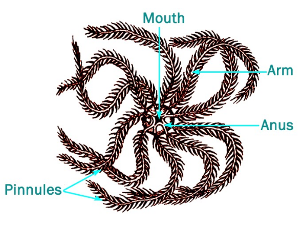All the given animals are from the phylum Echinodermata, and all are marine with organ-system level of organization. The zoological name of ‘sea lily’ is Antedon. Antedon is also known as feather star, which is an inhabitant of the shallow water. It is a stalked form at the beginning and with the attainment of adulthood it breaks off from its stalk and swims out actively using the arms. They can also cling to the substratum by the cirri. They feed on microscopic living organisms. Other crinoids like Asterias resemble sea lilies; but they lack a stalk and can move from place to place. The stalk of sea lily is surmounted by a bulbous body with frond-like tentacles, and it resembles a plant. The common names of other organisms are Asterias (star fish), Holothuria (sea cucumbers), and Echinus (sea urchin).