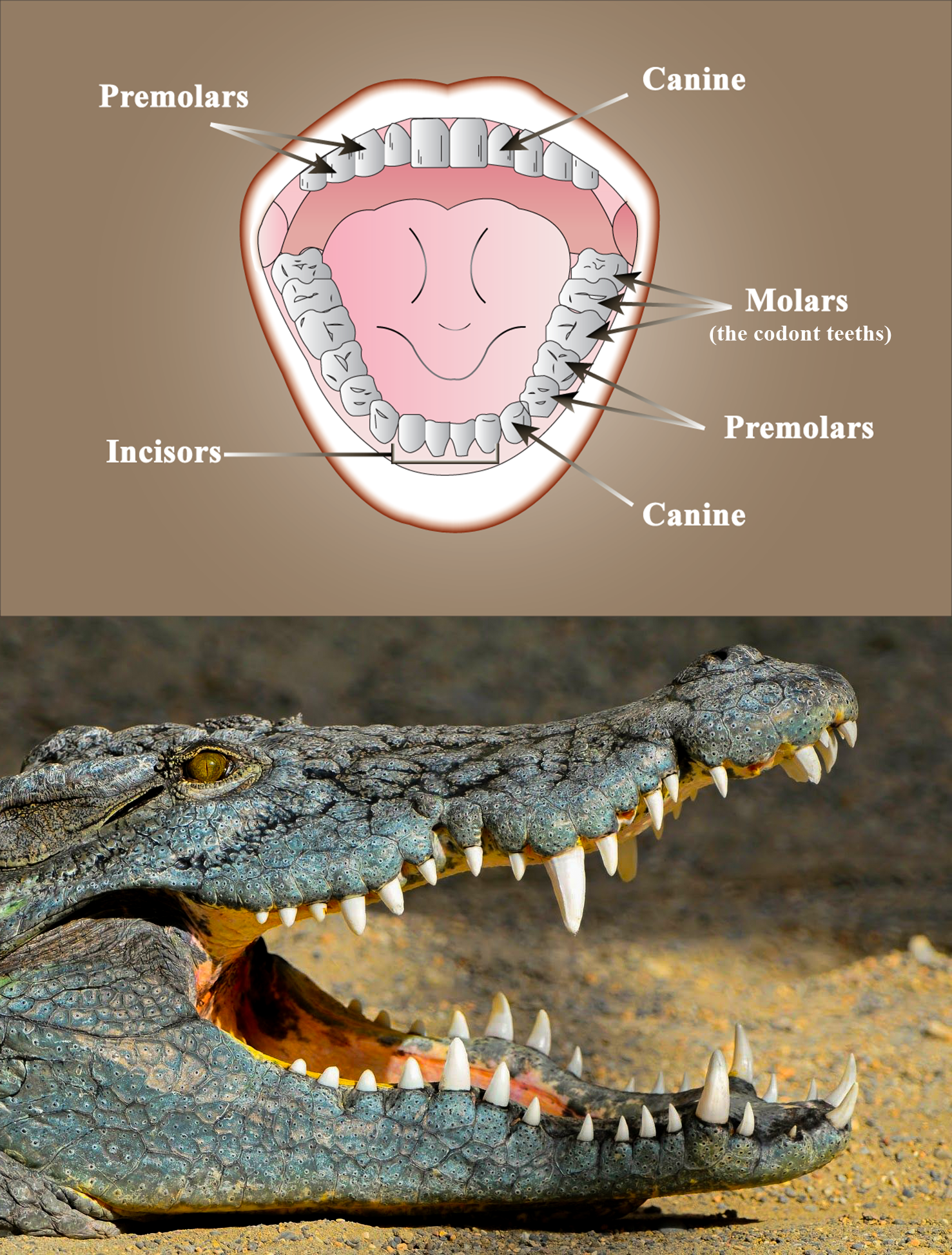 Thecodont teeth are present in crocodiles, mammals, and dinosaurs. It is a type of tooth present in the animals where the root of the teeth is firmly attached in the socket of the jawbone, an archosaurian characteristic that was inherited by the dinosaurs. This attachment is the strongest in the vertebrates. The species having thecodont detention do not lose their teeth easily.
