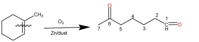 The given compound is methyl cyclohexene and ozone is trioxygen that is \[{\text{ }}{{\text{O}}_3}{\text{ }}\] . Methyl cyclohexene reacts with ozone in the presence of zinc dust and produces a linear chain aldehyde, that is 6-oxoheptanal, the reaction occurs as follow: