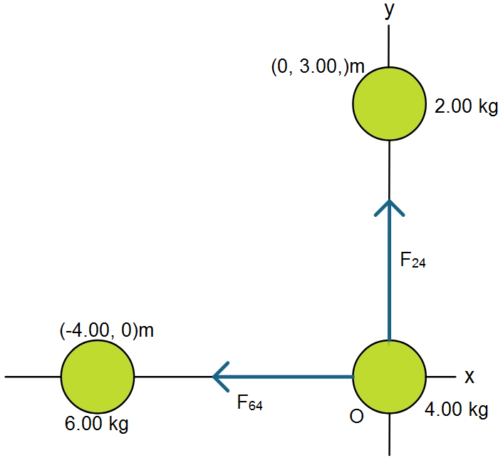 $F_{24} = 6.67 \times 10^{-11} \times \dfrac{2 \times 4}{3^2} = 5.932 \times 10^{-11}$ N = 59.3 pN (approx.)