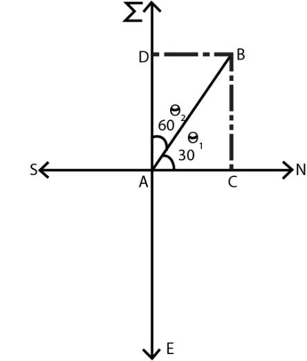 Now as the angle between north and west direction is 900 and it is given that ${\theta _1} = {30^0}$ then we can find the value of $θ_2$ i.e. ${\theta _2} = {90^0} - {\theta _1} = {90^0} - {30^0} = {60^0}$