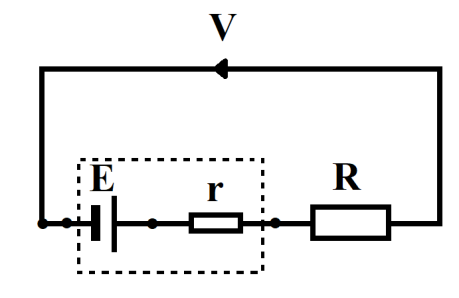 To verify Ohm's law, a student connects the voltmeter across the battery as shown in the figure. The measured voltage is plotted as a function of the current, and the following graph is obtained: