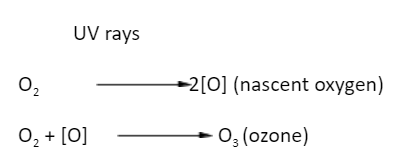 Atmosphere is composed of many gases like nitrogen (78%), oxygen (21%), carbon dioxide(0.33%) and miscellaneous (1%). In the atmosphere, the ultraviolet rays cause photochemical splitting. It breaks the atmospheric oxygen to form 2[O]. This nascent [O] undergoes collision with other oxygen molecules to form two ozone molecules.