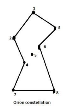 We can see from the figure that the Orion constellation resembles a ‘hunter’ in kneeling position due to the way in which all eight stars are arranged.