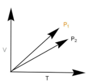 According to the above formula slope and pressure are inversely proportional to each other. Now it is clear that the slope of \[{{\text{P}}_1}\] line is more than the slope of \[{{\text{P}}_2}\] . Slope represents tangent of angle. The line \[{{\text{P}}_1}\] makes a greater angle and hence has higher slope. Thus the pressure \[{{\text{P}}_1}\] will be lesser than \[{{\text{P}}_2}\] .