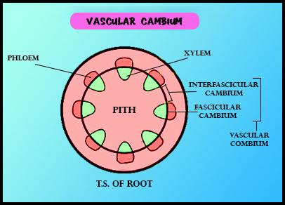 The vascular cambium is the main growth tissue of stem and roots in many plants especially in dicotyledonous plants as well as some gymnosperms and certain vascular plants. This type of tissue produces secondary xylem towards the pit and secondary phloem towards the bark as shown in the diagram below-
