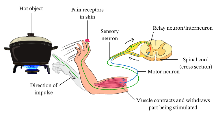 In a reflex action, these many types of neurons operate together. A reflex action is an automatic (involuntary) and quick reaction to a stimulus that protects the body from potentially dangerous situations like touching something hot. Many species' existence depends on their ability to react quickly. This typical process is followed by a reflex action, which does not involve the conscious section of the brain. This is why there is such a quick response.