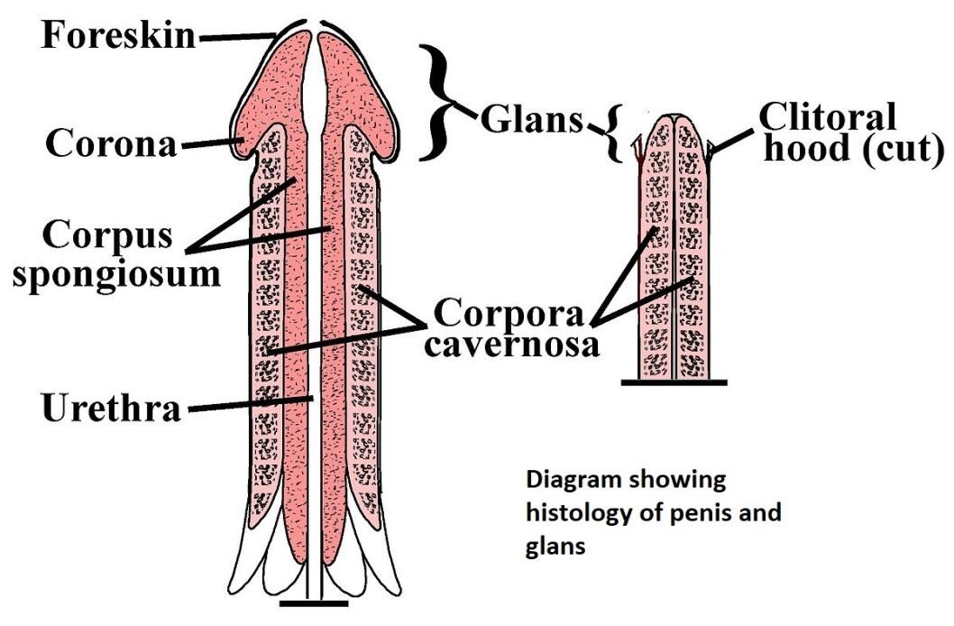 The glans (head) of the penis is coated with pink, moist tissue termed mucosa in uncircumcised men. The foreskin protects the glans (prepuce). The foreskin is surgically removed in circumcised men, and the mucosa on the glans turns into dry skin.
