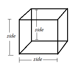 Volume of cube = \[side\times side\times side\] = \[sid{{e}^{3}}\]
