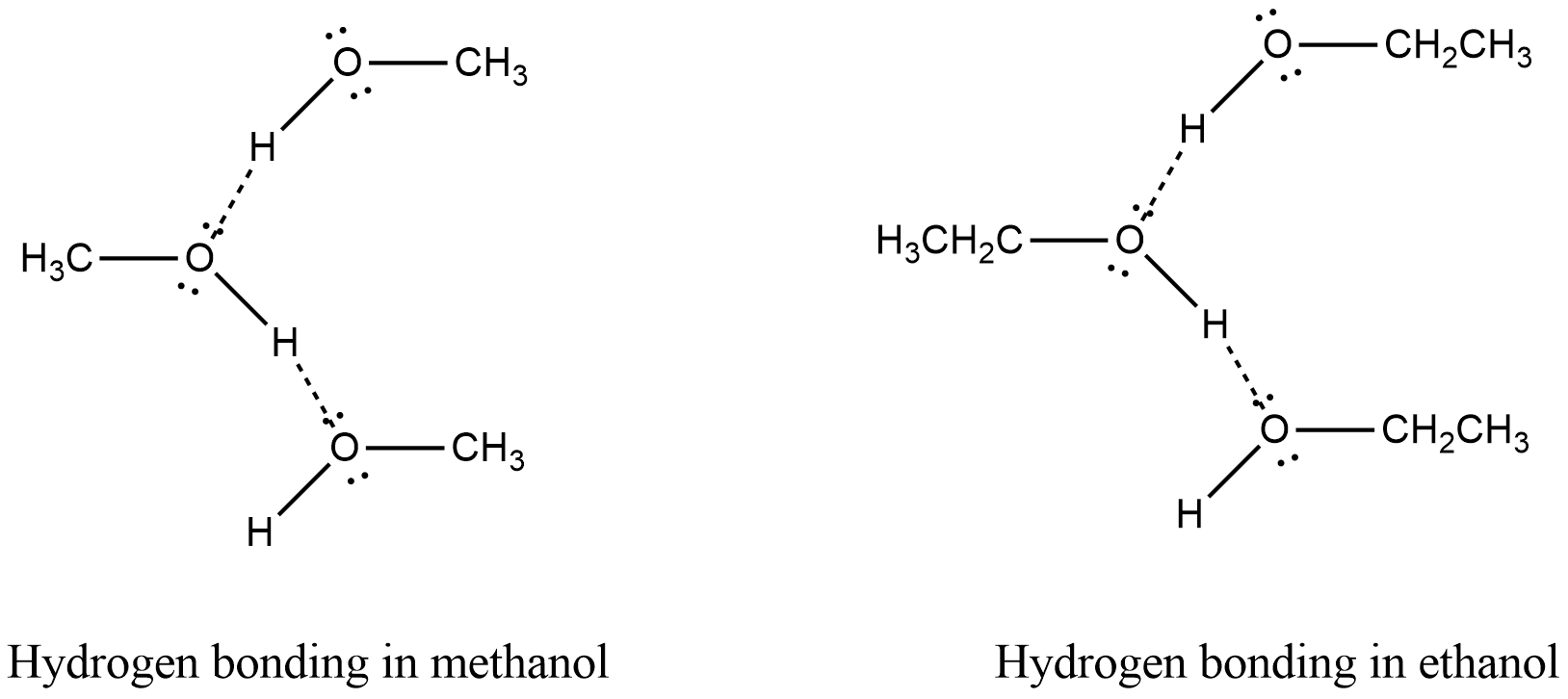 Among the following options, hydrogen bond is present in methanol and ethanol. Because in both methanol and ethanol hydrogen is bonded to oxygen, a highly electronegative element. Thus this hydrogen can form hydrogen bonds with oxygen atoms of another molecule. Hydrogen bonds in methanol and ethanol are shown in the figure.