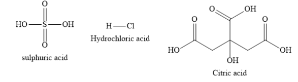 Write the structures of sulphuric acid, hydrochloric acid and citric acid as shown below: