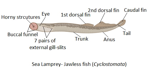 Hint: The gill-bearing aquatic animals that lack limbs with digits are called fishes. They include cartilaginous, hagfish, lampreys, and bony fishes. The jawless fish means the fish species which lack true jaw or defined jaw structure. These are lampreys and hagfish. They have horny epidermal structures in their mouth.