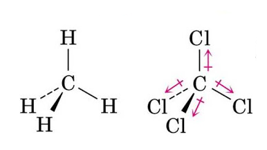Similarly, in Methane, $C{{H}_{4}}$ having tetrahedral geometry, the dipole moments of the C-H bonds cancel out each other in the symmetric molecule, making it non-polar. And, in carbon-tetrachloride, $CC{{l}_{4}}$ having the chlorine atom being highly electronegative. The resultant dipole moment is again zero and the molecule is nonpolar.